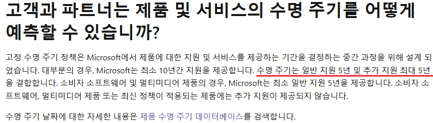 일반적으로 수명주기를 일반 지원(Mainstream Support) 5년, 추가 지원(Extended Support) 최대 5년으로 정하고 있다.