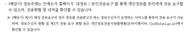 > 본인 대상 전송요그의 경우 본인전송요구 방법, 전송 현황 및 내역을 확인할 수 있는 방법 기재(단, 보건의료 및 에너지 정보 전송자의 경우 중계 전문기관이 대신 기재 가능)