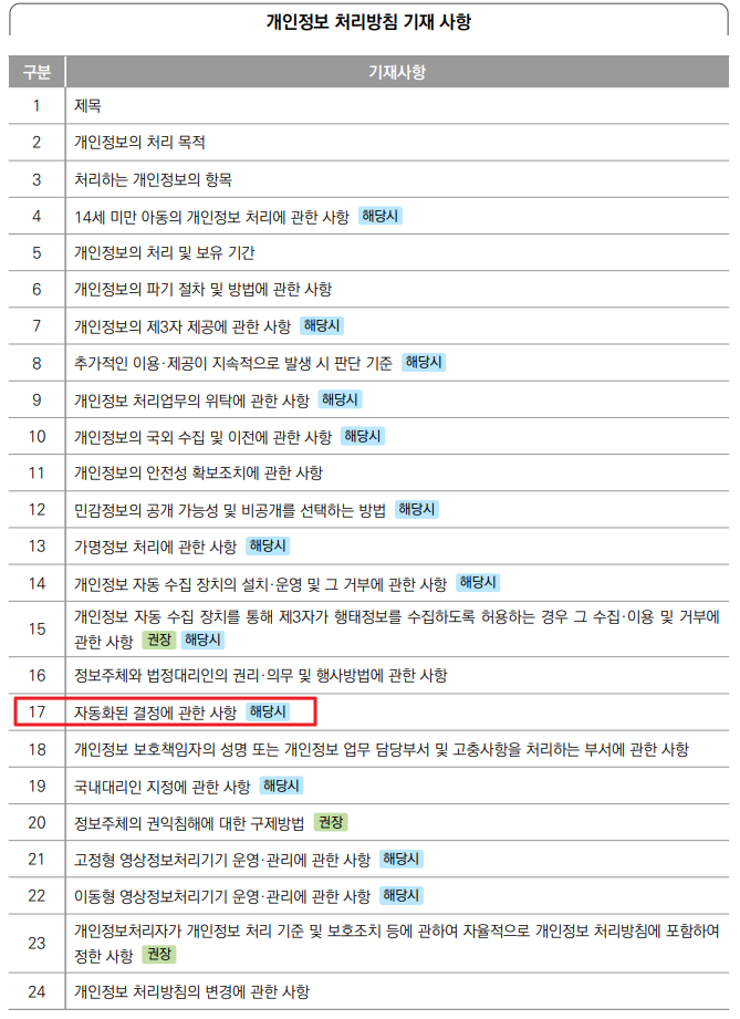 14. (61페이지) 자동화된 결정을 하는 경우 기준과 절차, 개인정보가 처리되는 방식 등을 기재해야 함