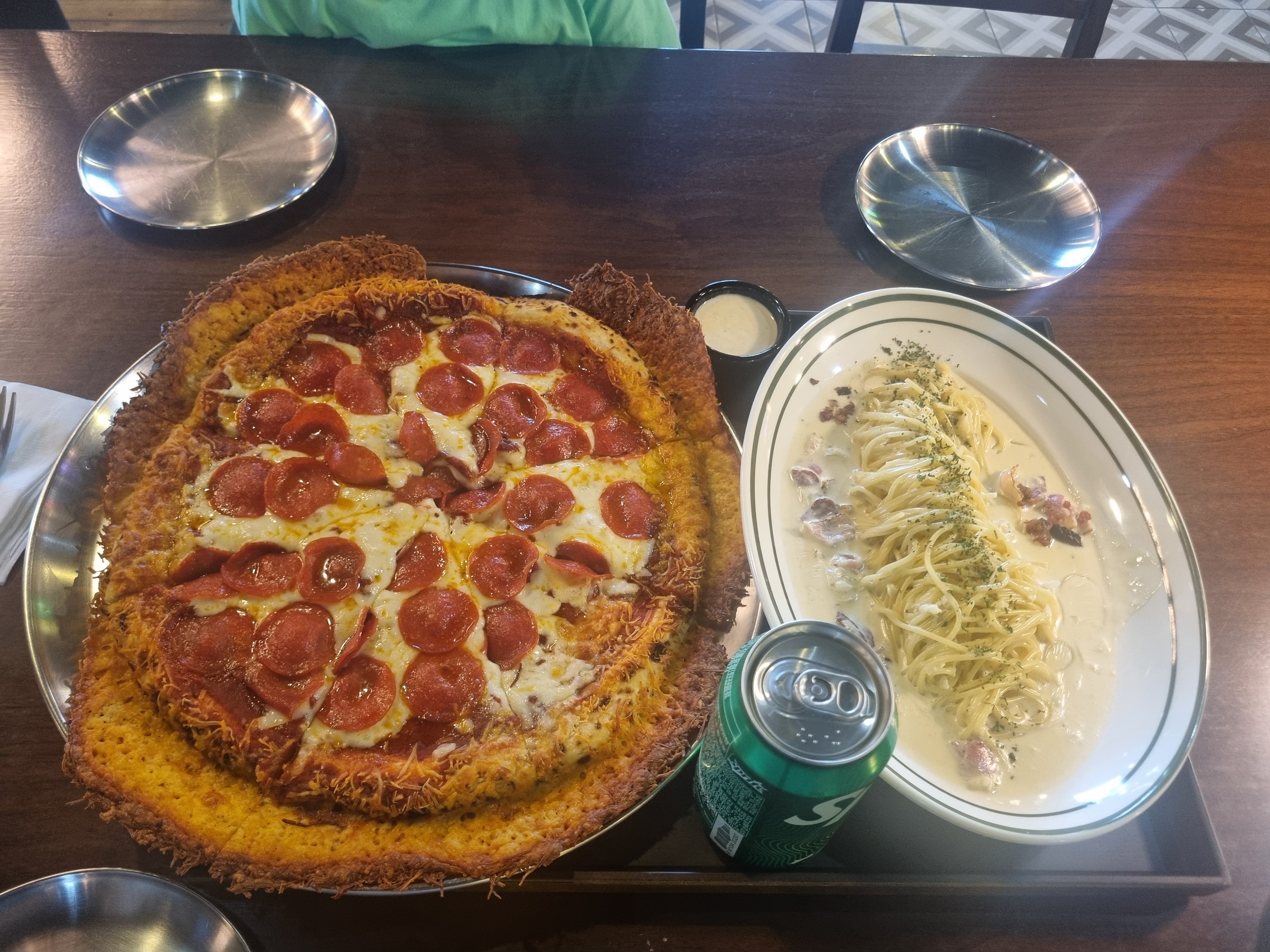 늘 주로 시키는 메뉴는 베이글 페퍼로니 피자와 베이컨 치즈 크림 파스타다. 일반적인 피자집과는 달리 피클을 주지 않기 때문에 느끼한 음식을 잘 먹지 못하는 분들은 3,000원을 내고 코울슬로를 꼭 주문하시는 게 좋다.