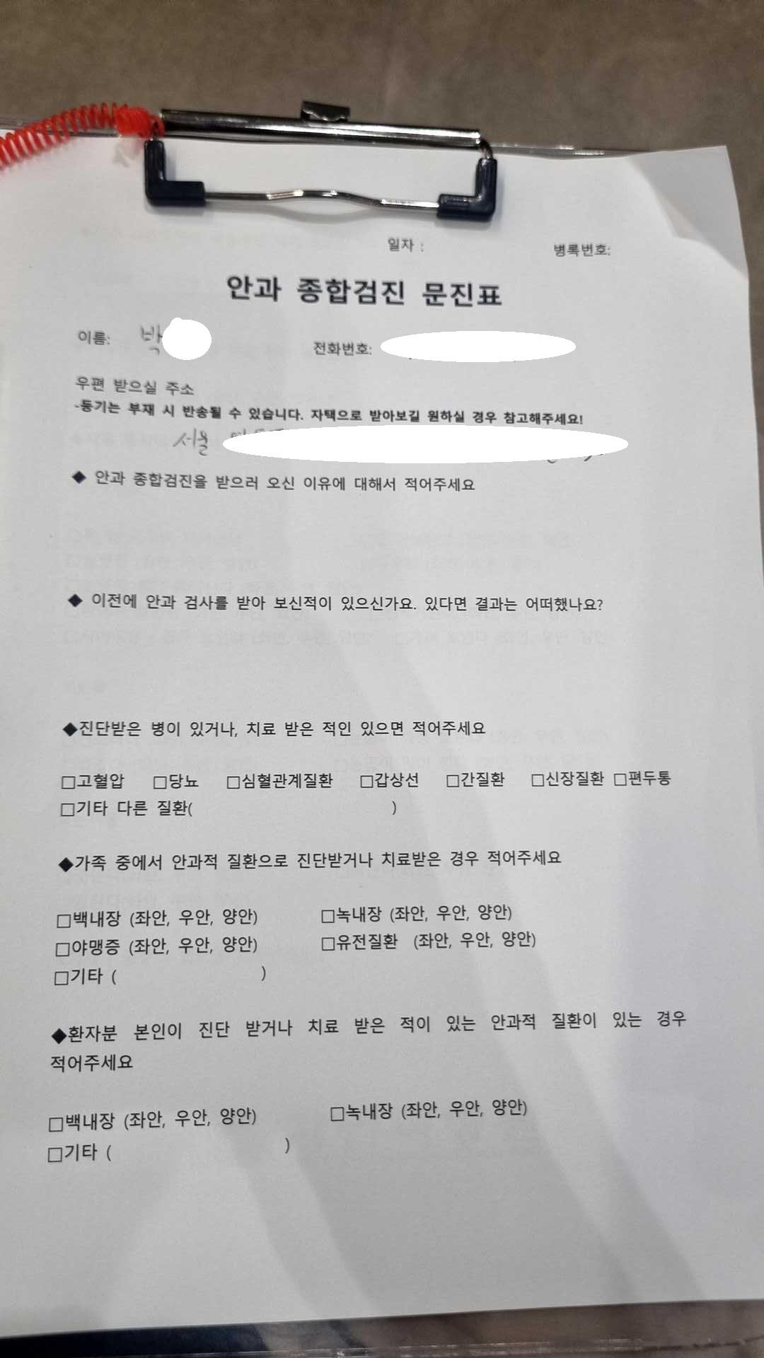 라식센터에 도착하면 종합검진 문진표를 먼저 제출해야 한다.