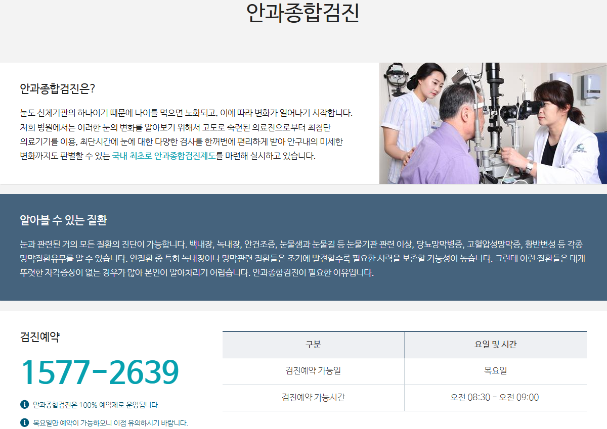 종합검진 동선 : 본관 1층 접수창구 -> 본관 5층 라식 센터 -> 본관 2층 백내장 센터 -> 망막병원 1층 망막검사실