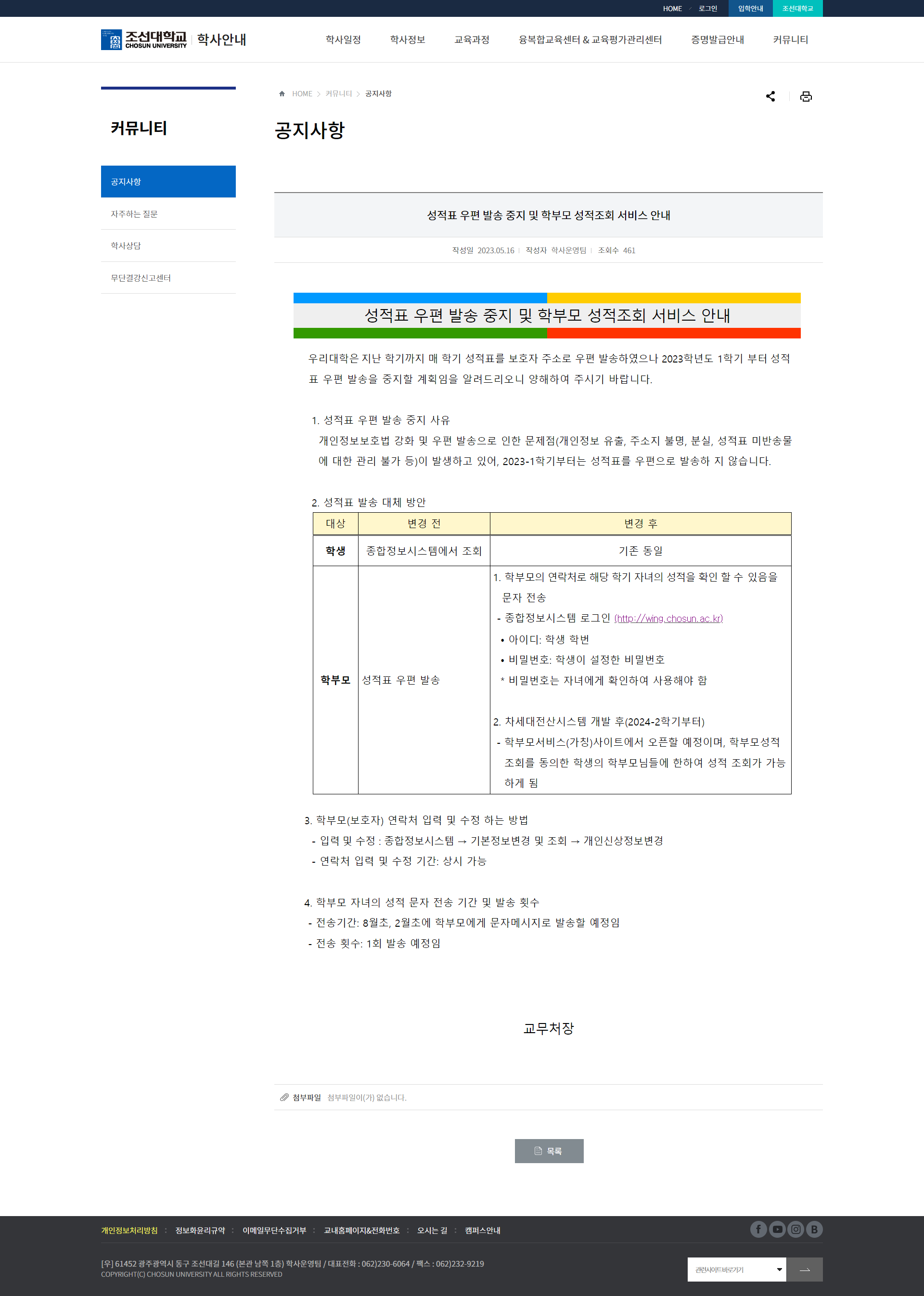 환경보호가 아닌 개인정보보호를 위해 성적표 우편 발송을 중지한다는 조선대학교의 공지사항이 20년도 더 된 그 시절을 회고할 수 있게 해주었고, 잠시나마 개인정보보호에 대한 사회적 인식이 정말 변하고 있음을 다시 한번 느끼게 하는 순간이었다.
