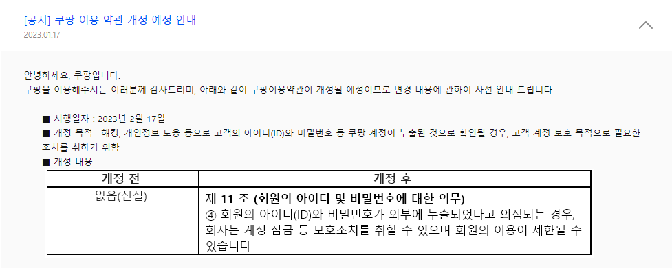 쿠팡은 고객의 아이디(ID)와 비밀번호가 외부에 유출됐다고 의심되는 경우 쿠팡이 계정 잠금 등 보호조치를 취할 수 있고, 고객의 이용을 제한할 수 있다는 내용을 이용약관에 포함할 예정