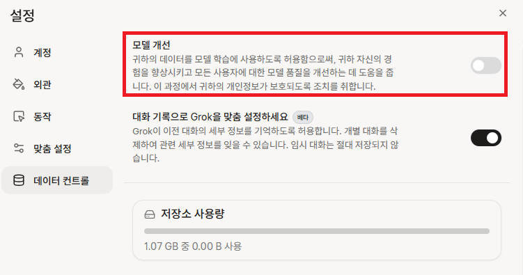 | Grok | 좌측 하단 프로필 클릭 > 설정 > 데이터 컨트롤 > 모델 개선 비활성화 (모바일 앱은 사이드바 > 좌측 하단 프로필 클릭 > 데이터 제어 > 모델 개선 비활성화) ![]() |