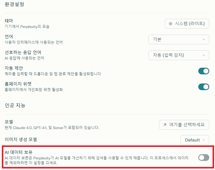 | Perplexity | 좌측 하단 프로필 클릭 > 환경설정 > AI 데이터 보유 비활성화 (모바일 앱은 좌측 하단 프로필 클릭 > 환경설정 > AI 데이터 보유 비활성화) ![]() |