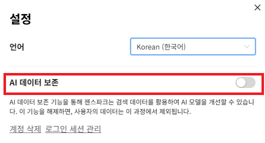 | Genspark AI | 좌측 하단 내 정보 아이콘 클릭 > 설정 > AI 데이터 보존 비활성화 (모바일 앱은 우측 하단 내 정보 클릭 > 설정 > AI 데이터 보존 비활성화) ![]() |