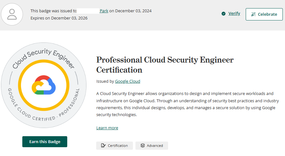 그럼에도 작년 한 해 동안 구글 클라우드 보안 자격 준비에 상당히 많은 시간을 투자하고 12월 3일에 응시한 시험에서 합격함으로써 2026년 12월 3일까지 자격을 보유하게 된 건 클라우드 환경에 대한 기본적인 이해도를 갖고 있음을 어필할 수 있는 게 있으면 도움이 되겠단 생각과, 회사에서 요구한 자기 개발 KPI에 포함할 그럴싸한(?) 뭔가가 필요하기도 했고, 자격 준비 전에 짧게나마 공부했던 구글 클라우드 관련 지식들이 사라지는 것을 원치 않았기 때문이다.
